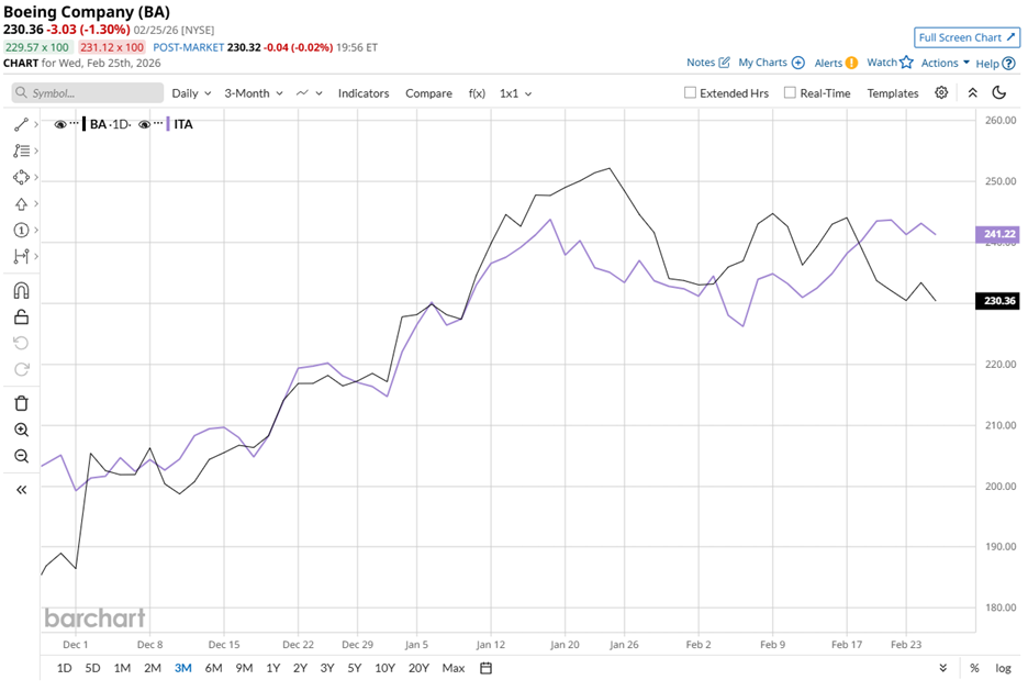 Boeing’s shares currently trade 9.4% below their January peak of $254.35 but have surged 26.3% over the past three months. By comparison, the iShares U.S. Aerospace & Defense ETF (ITA) rose 19.2% over the same period, highlighting Boeing’s near-term outperformance.