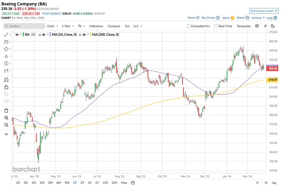 Fundamentals are reinforcing the stock’s trajectory. On Feb. 3, Boeing and Air Cambodia announced the airline’s largest single-aisle order ever, up to 20 737 MAX aircraft, revealed at the Singapore Airshow. This catalyzed a 1.2% gain in Boeing's shares the following trading session, signaling renewed investor confidence.