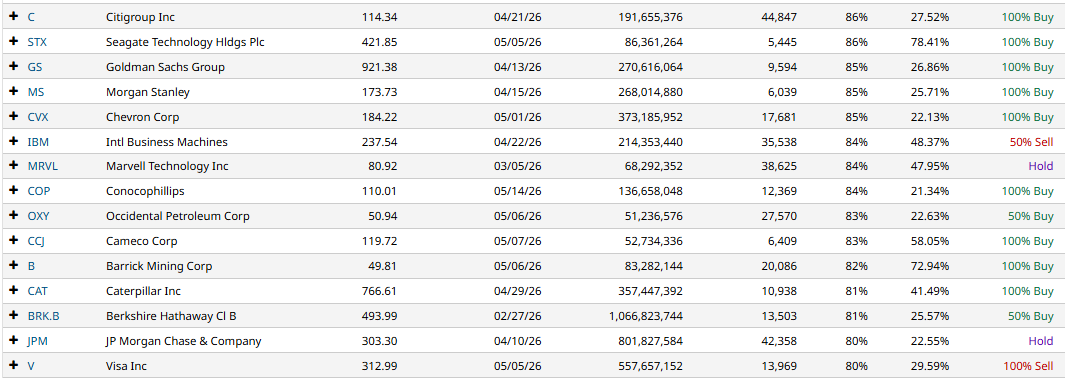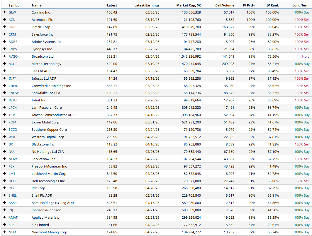 This screener gives us the following stocks ranked from highest IV Percentile to lowest: