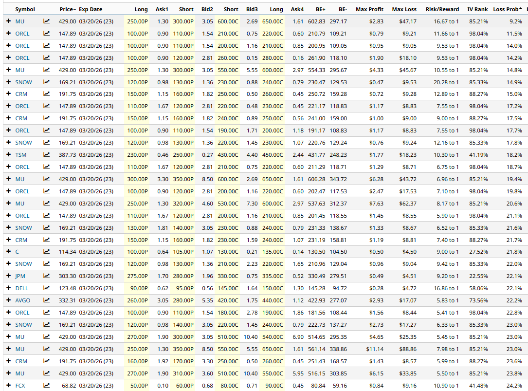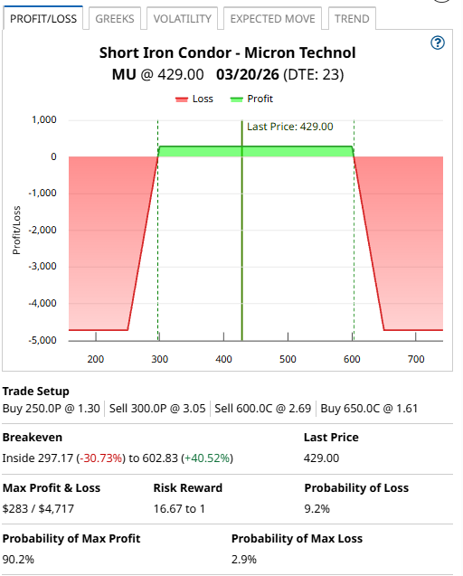 Micron Technology is due to report earnings on March 18, so this trade would have earnings risk if held to expiration.