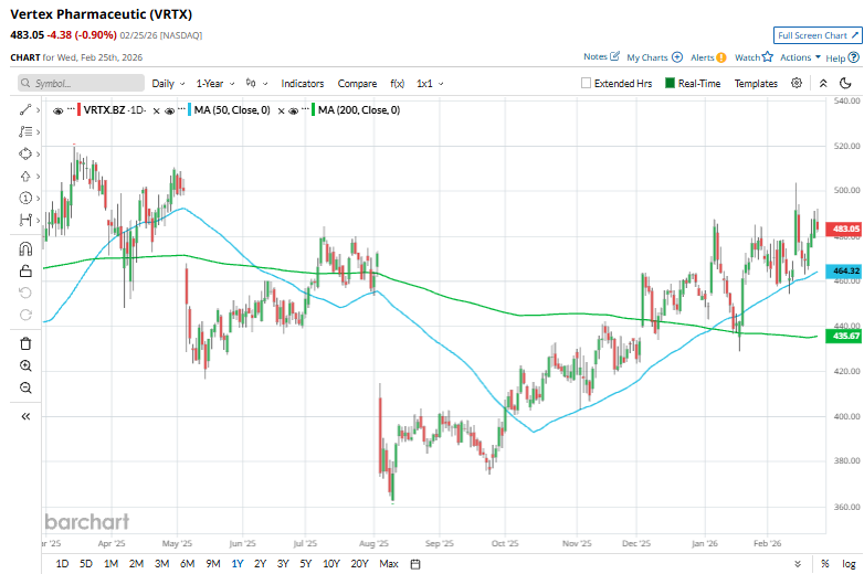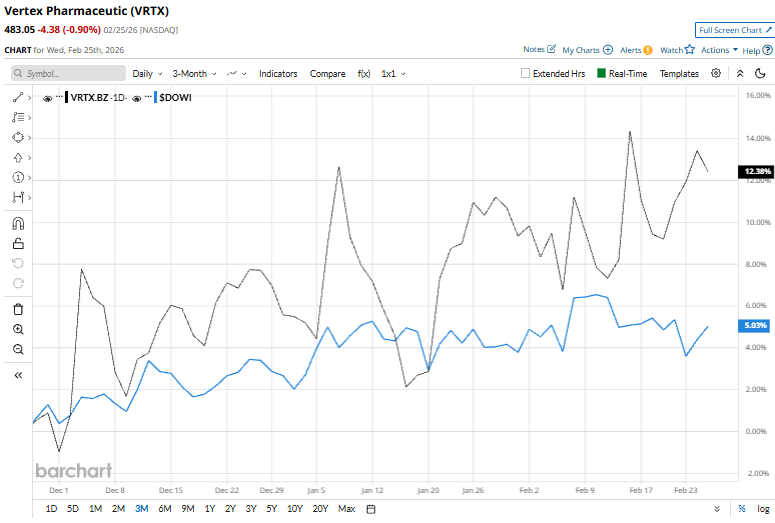 However, the pharma company has fallen 7.1% from its 52-week high of $519.68 achieved on March 14 last year. Despite this recent pullback, shares of Vertex have gained 12.4% over the past three months, outpacing the Dow Jones Industrial Average’s ($DOWI) 5% rise during the same time frame.
