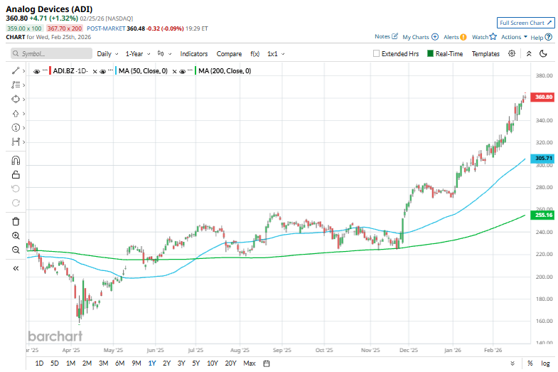 Over the past 52 weeks, Analog Devices’ shares have gained 53.3%, while they have been up 33% in 2026. Meanwhile, the XSD has gained 55.7% and 13%, respectively.