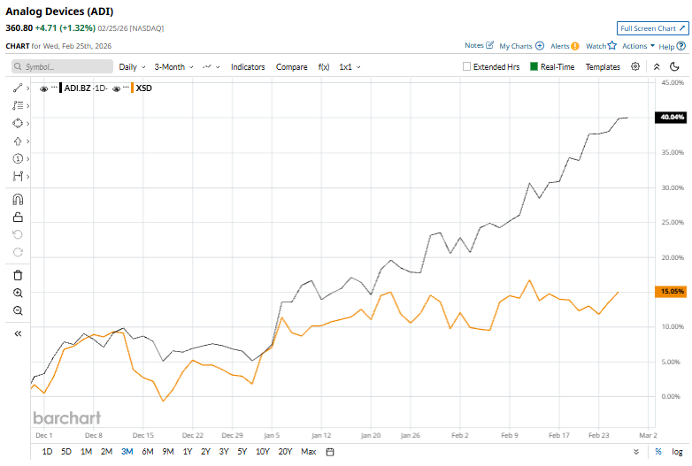 Analog Devices’ stock reached a 52-week high of $363.20 in the last trading session and has surged 43.2% over the past three months. In contrast, the State Street SPDR S&P Semiconductor ETF (XSD) has gained 17% in the same time frame.