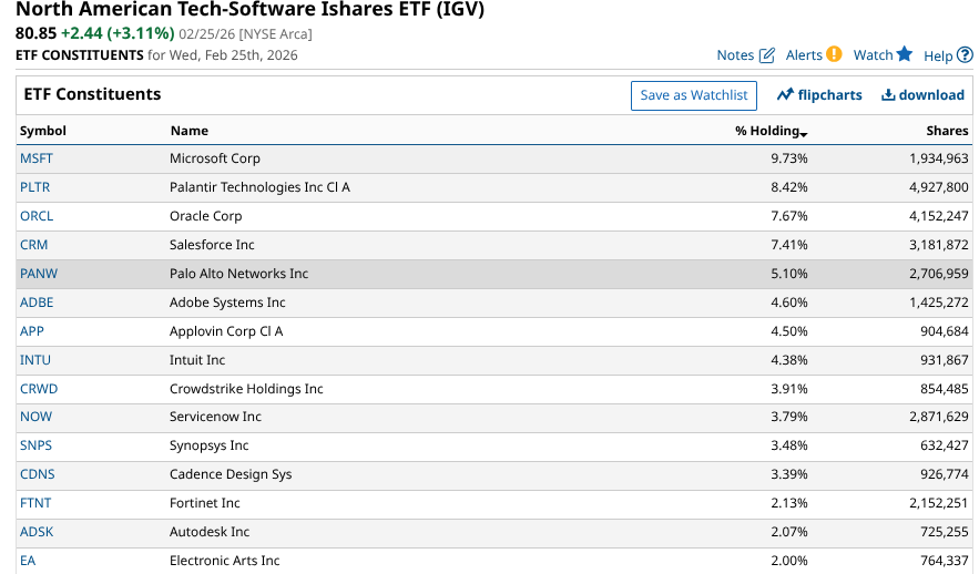 There are well over 100 stocks in this ETF, as it spans the cap size range, well beyond the big, iconic software stocks. However, only 10 of them account for nearly 60% of assets. So as they go, so goes IGV. And perhaps the tech sector as well.
