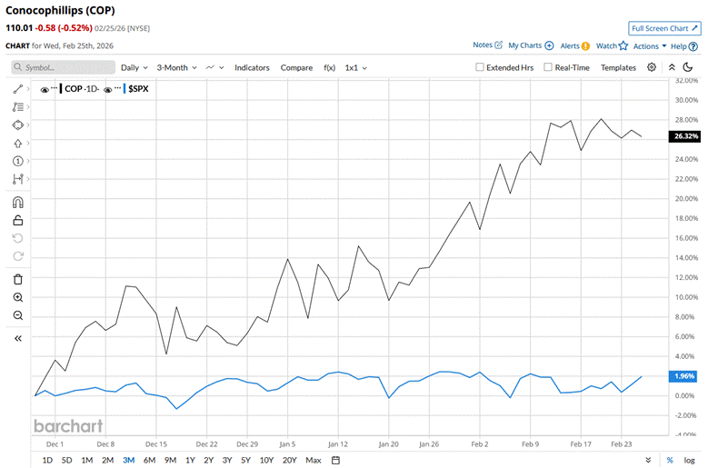 The stock recently touched its 52-week high of $113.80 on Feb. 19, and is currently trading 3.3% below that peak. COP stock has grown 27% over the past three months, outperforming the S&P 500 Index’s ($SPX) 2.7% surge during the same time frame.