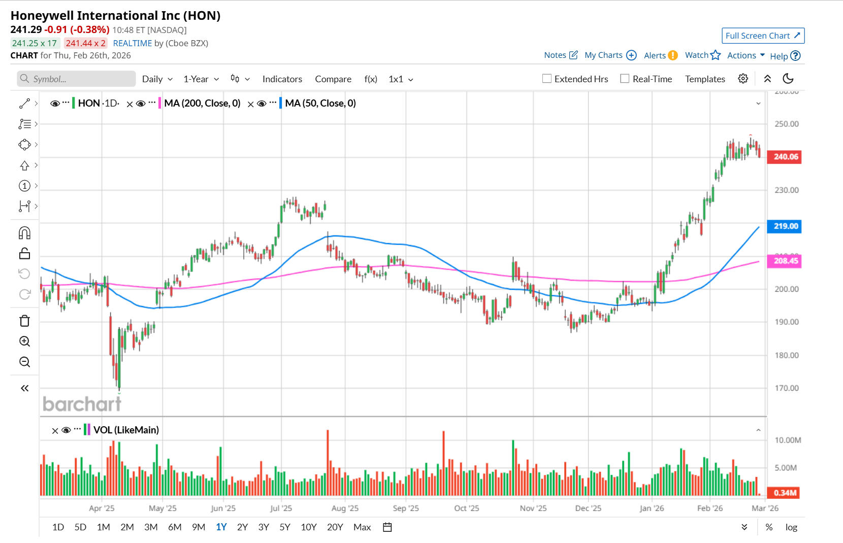 To confirm its bullish trend, HON has been trading above its 200-day moving average since early January and has remained above its 50-day moving average since mid-December, with slight fluctuations.