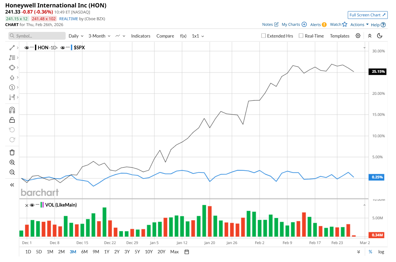 This industrial giant is currently trading 2.4% below its 52-week high of $246, reached on Feb. 23. Shares of HON have rallied 27% over the past three months, considerably outperforming the S&P 500 Index’s ($SPX) 1.6% rise during the same time frame.