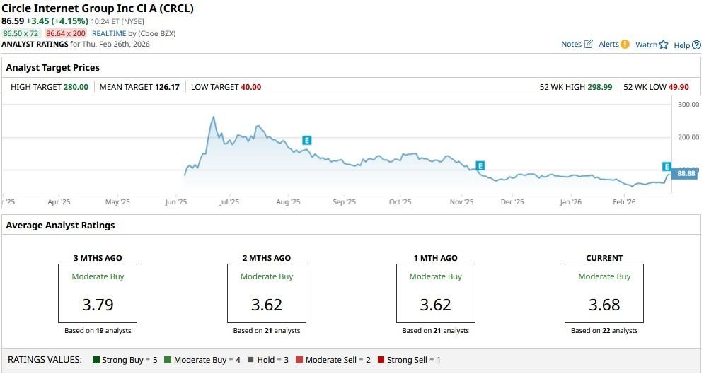 The consensus rating on CRCL shares remains at “Moderate Buy,” with the mean target of roughly $126 indicating potential upside of nearly 45% from here.