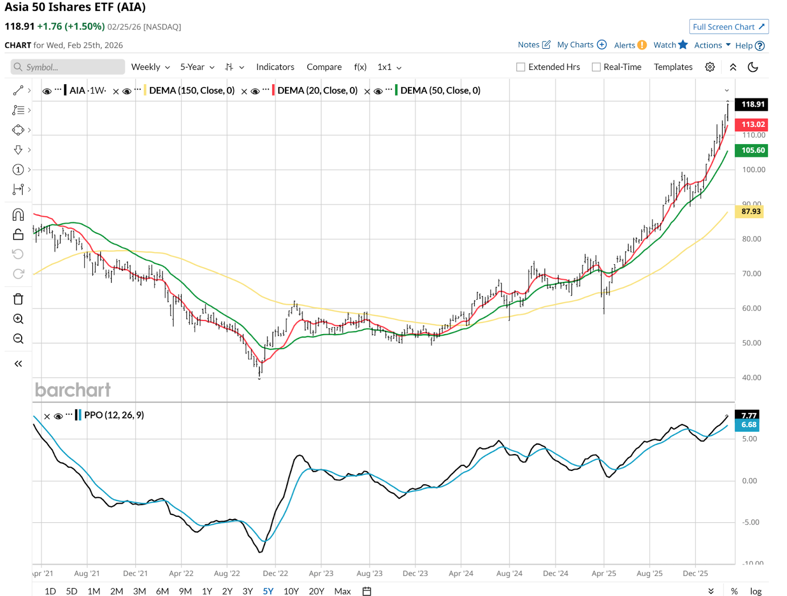 As with the iShares Asia 50 ETF (AIA). This has been my go-to for non-Japan Asia investing. I like its simple, 50-stock, market-cap-weighted structure. I’ve owned it a few times over the years, but not recently. Because I find the global stock market too highly correlated to be excited about drifting very far from where the market’s core is — the S&P 500 Index ($SPX), and the Dow ($DOWI) and Nasdaq ($NASX).