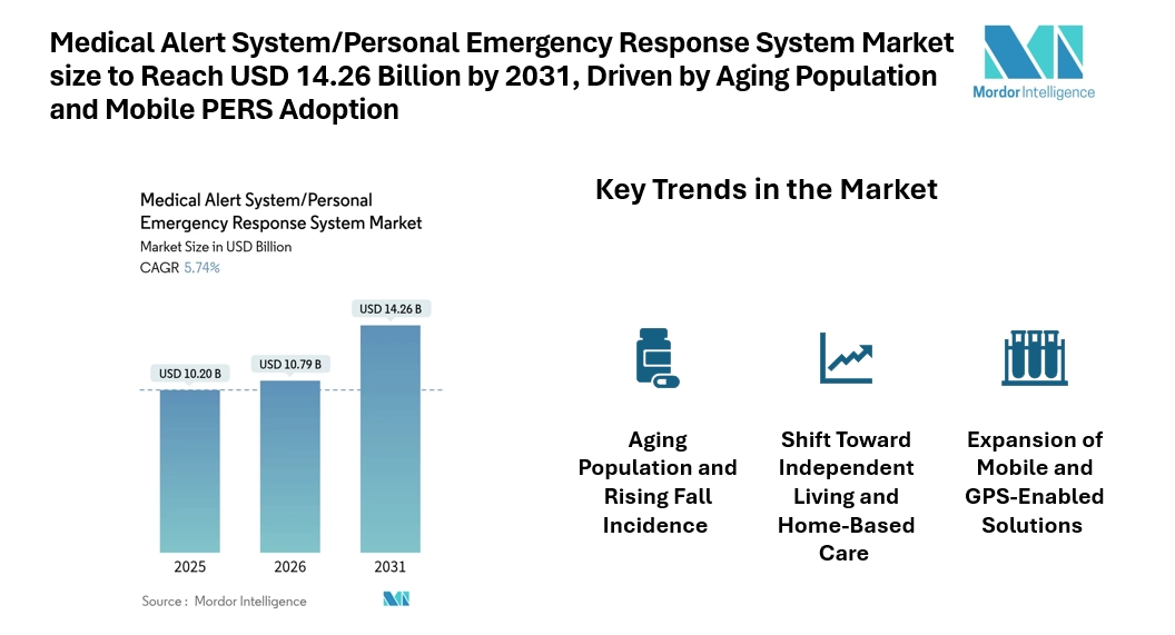 According to Mordor Intelligence, the medical alert system/personal emergency response system market size is estimated at USD 10.79 billion in 2026, projected to reach USD 14.26 billion by 2031, registering a CAGR of 5.74% during the forecast period.