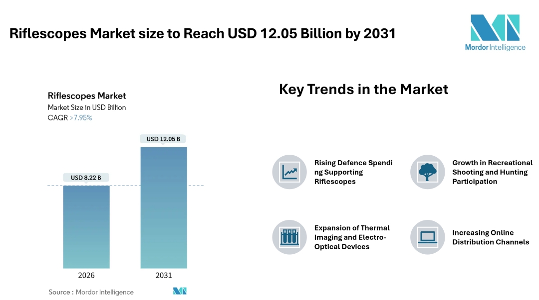 To view the original version on ABNewswire visit: Riflescopes Market size to Reach USD 12.05 Billion by 2031 Driven by Defence Procurement and Recreational Shooting Demand - Mordor Intelligence