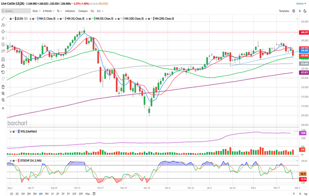 April Live Cattle closed at 236.900 today, dropping 3.375 on the day. This marks the lowest close since February 5th and is the 2nd lowest close of the month. The 50-day moving average (green, 236.200) held as support today. However, yesterday’s trade saw the 5- and 10-day averages make a bearish crossover and the 5-day (blue, 239.500) seemed to act as resistance today and the 10-day (red, 240.755) was never tested on Thursday. There’s a blue trendline drawn on the chart above, connecting the lows in January and February, and today’s trade broke through that. The 100-day moving average (grey, 232.660) has basically been a flat line since before Christmas, which indicates to me that this market is need of directional momentum. The 200-day average (purple, 227.871) is well below the market and is still inclined higher. Stochastics (bottom sub-graph) are just starting to tick into oversold territory, but they haven’t been “oversold” since just before Thanksgiving. Technically, this market is showing some signs of short-term weakness, I think. But I’ve been saying that for a while, now, and the market remains in a sideways pattern. The first day of 2026 the market closed at 235.975…two months in and we’ve moved less than 1.000.