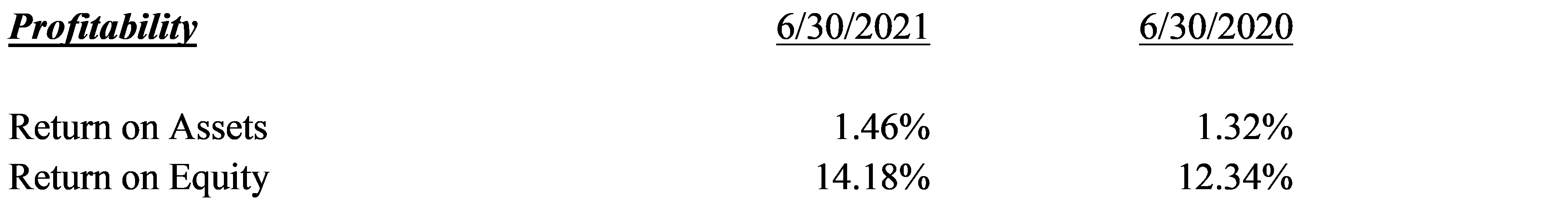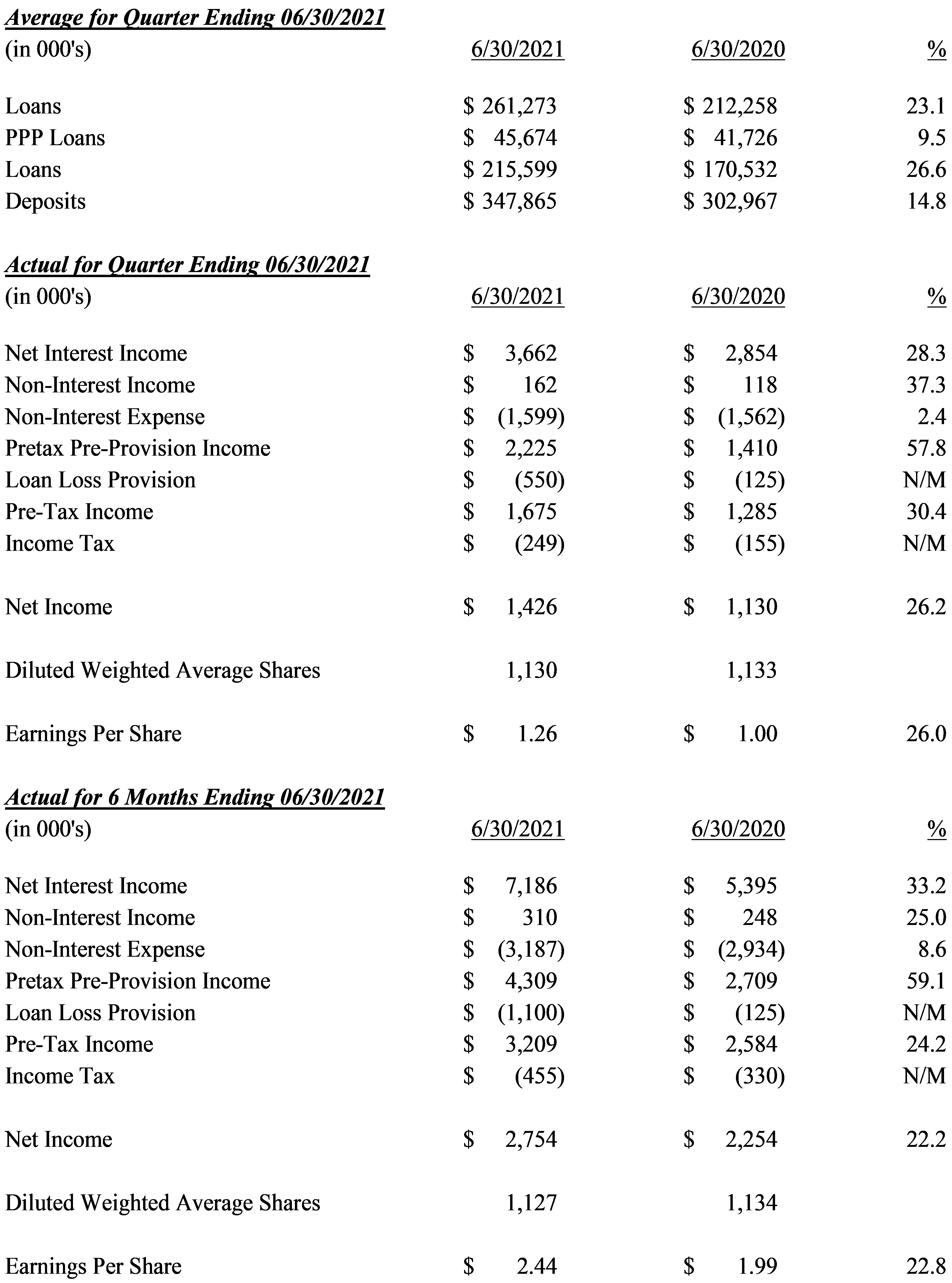 For the first six months of 2021, Net Income after Taxes amounted to $2,754,000, an increase of 22% over the first half of 2020 results of $2,254,000. Earnings per diluted common share for the first half of 2021 were $2.44, an increase of 23% over the first half of 2020 results of $1.99 per diluted common share.
