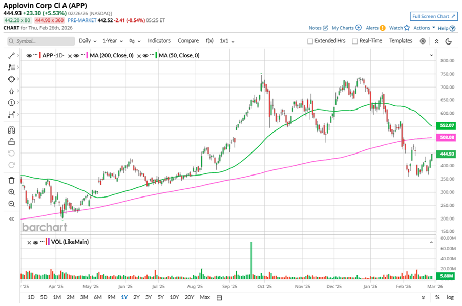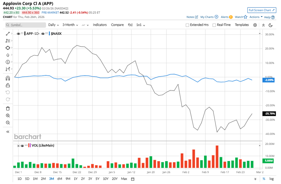 Despite its notable strength, APP slipped 40.3% from its 52-week high of $745.61, achieved on Sep. 29, 2025. Over the past three months, APP stock declined 24.1%, underperforming the Nasdaq Composite’s ($NASX) 1.5% dip during the same time frame.