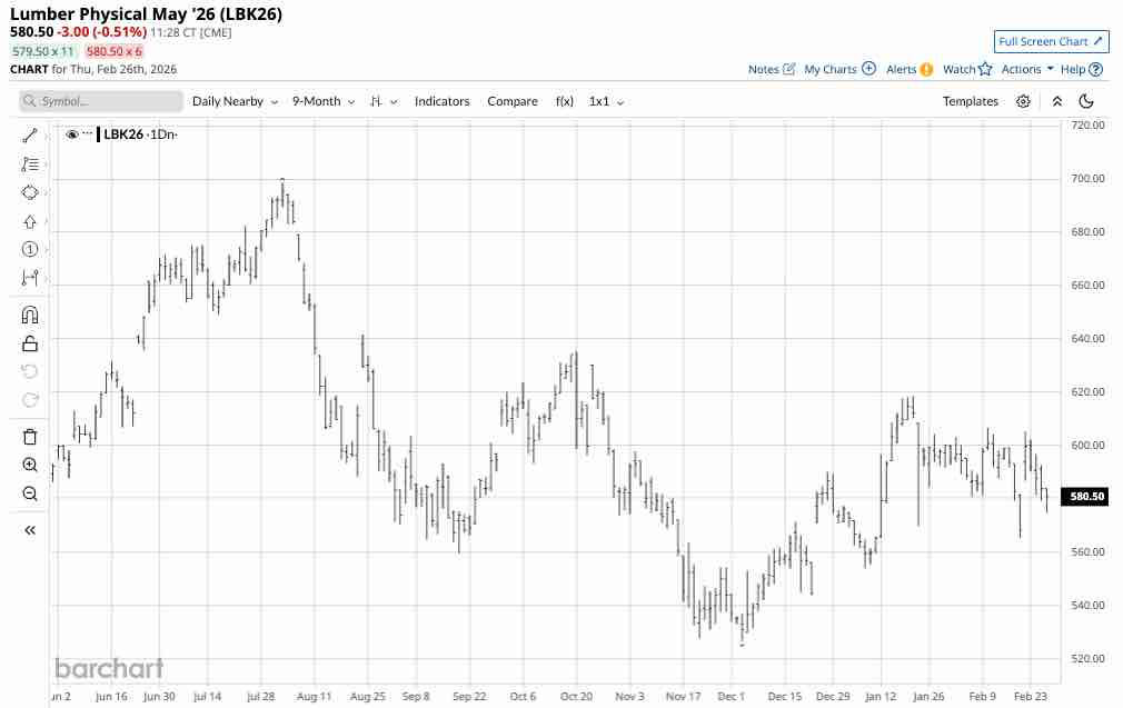 May physical lumber prices are trending bearish in late February 2026, which could be an opportunity if lower rates are on the horizon.