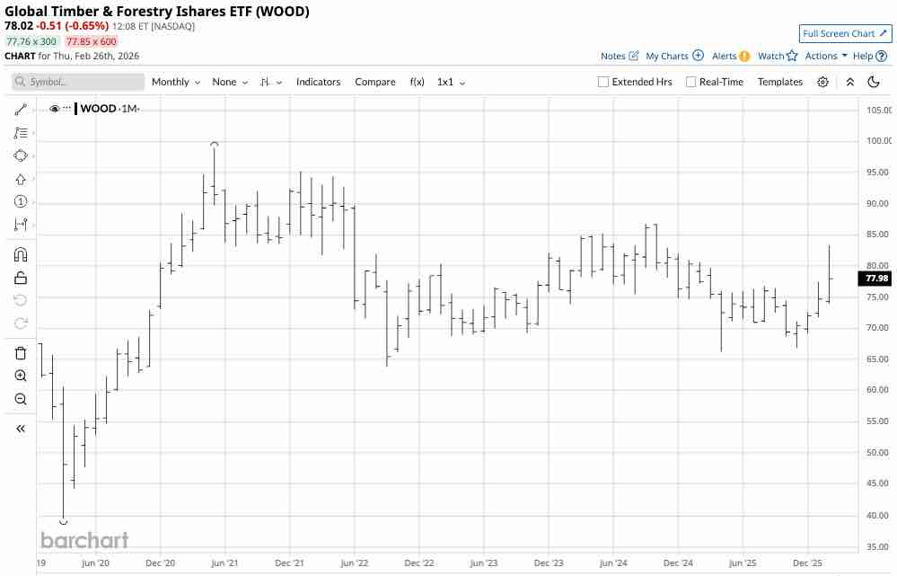 Nearby March physical lumber futures were trading at $598.50 on January 29, with lumber for May 2026 delivery at the $629 per 1,000 board feet level. The WOOD ETF was $79.24, the CUT ETF was $30.07, and WY shares were trading at $25.86. In late February, lumber futures prices and WY and WOOD shares were slightly lower, while the CUT ETF was slightly higher.