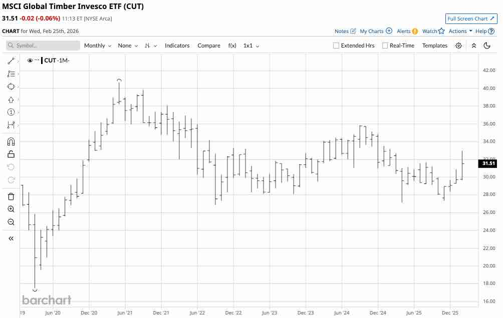 The monthly chart of the Invesco MSCI Global Timber ETF (CUT) shows that at $31.51 per share, technical resistance is at the September 2024 high of $35.86 per share. Support is at the April 2025 low of $27.12 per share.