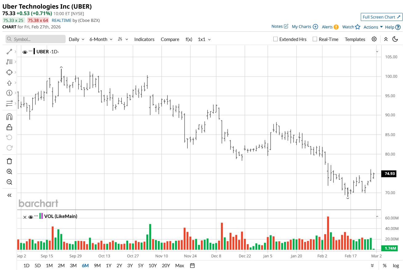 Based on these ratings, analysts have a mean price target of $106.27 currently, which would imply an upside potential of 41%. Further, the most bullish price target of $150 suggests that UBER stock could rise as much as 99% from here.