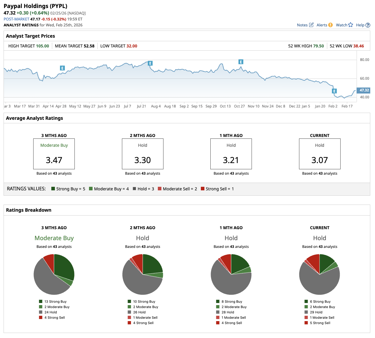 Out of the 43 analysts covering PYPL stock, six recommend “Strong Buy,” two recommend “Moderate Buy,” 29 recommend “Hold,” one recommends “Moderate Sell,” and five recommend “Strong Sell.” The average PayPal stock price target is $52.58 above the current price of about $47.