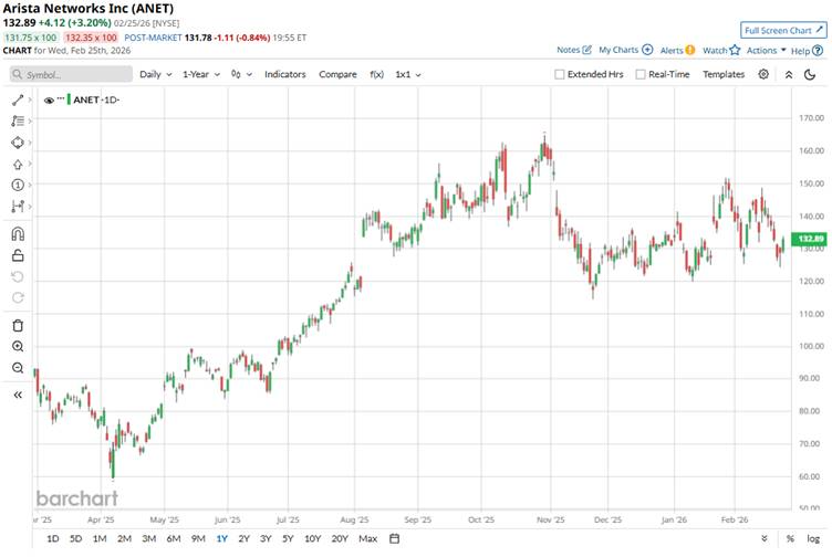 Additionally, Arista’s share price has experienced meaningful swings recently, with a notable intraday jump of 3.2% on Feb. 25, amid broader sector tailwinds from the ongoing AI infrastructure arms race, including sentiments around expanded AI hardware agreements such as the multi-year Advanced Micro Devices (AMD) and Meta Platforms (META) deal, which underscored strengthening demand fundamentals for data-center networking, a key end market for Arista.
