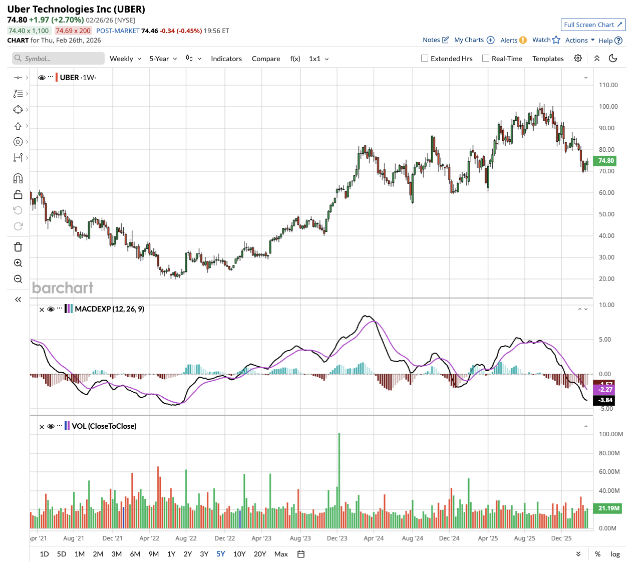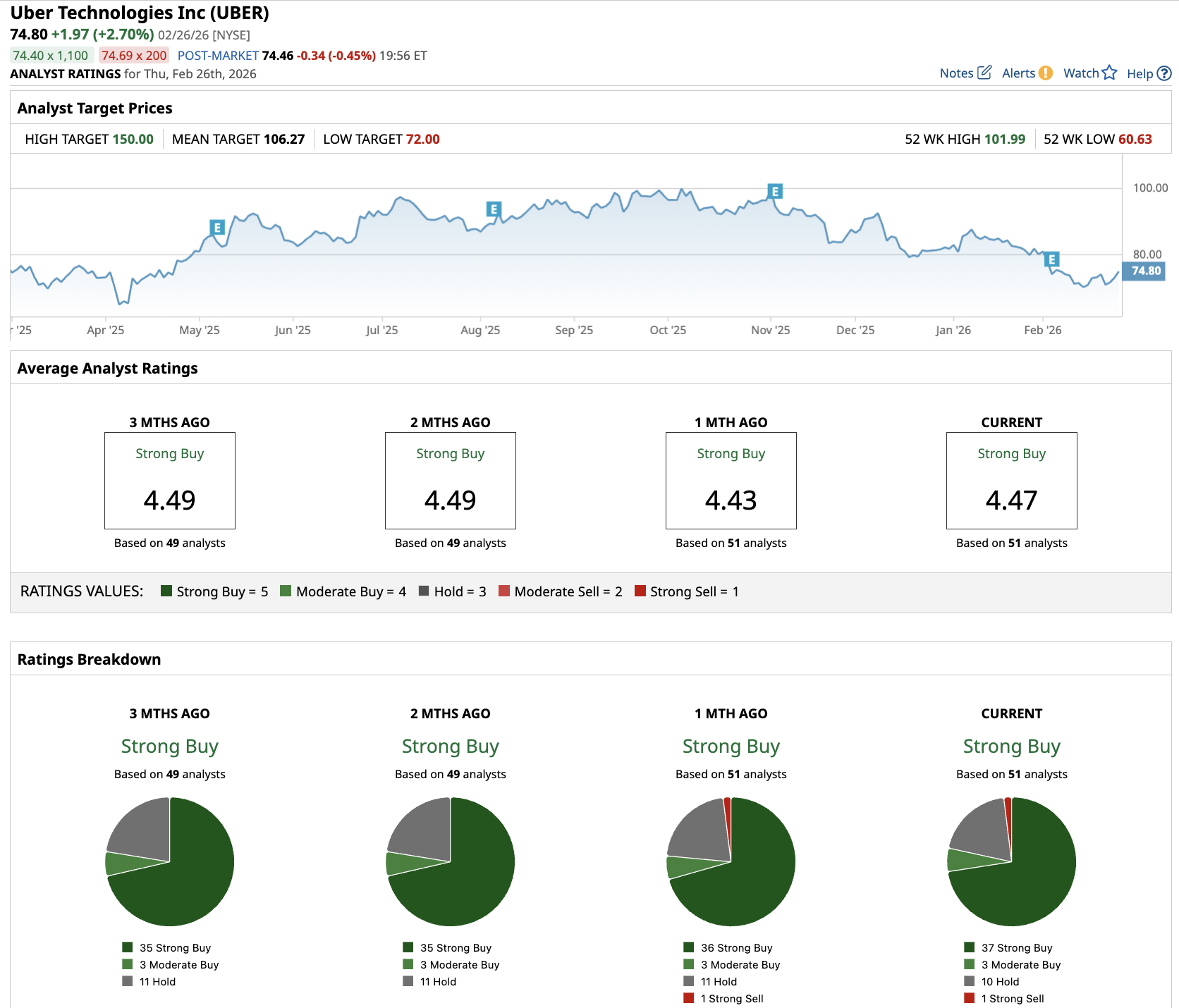 Out of the 51 analysts covering UBER stock, 37 recommend “Strong Buy,” three recommend “Moderate Buy,” 10 recommend “Hold,” and one recommends “Strong Sell.” The average UBER stock price target is $106.27, above the current price of about $75.