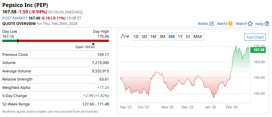 At the time of publication, PEP stock trades around $167, about 15% below its all-time high of $196.88. Meanwhile, the stock is up 10% over the last year, 17% year-to-date, and about 15% in the last month.