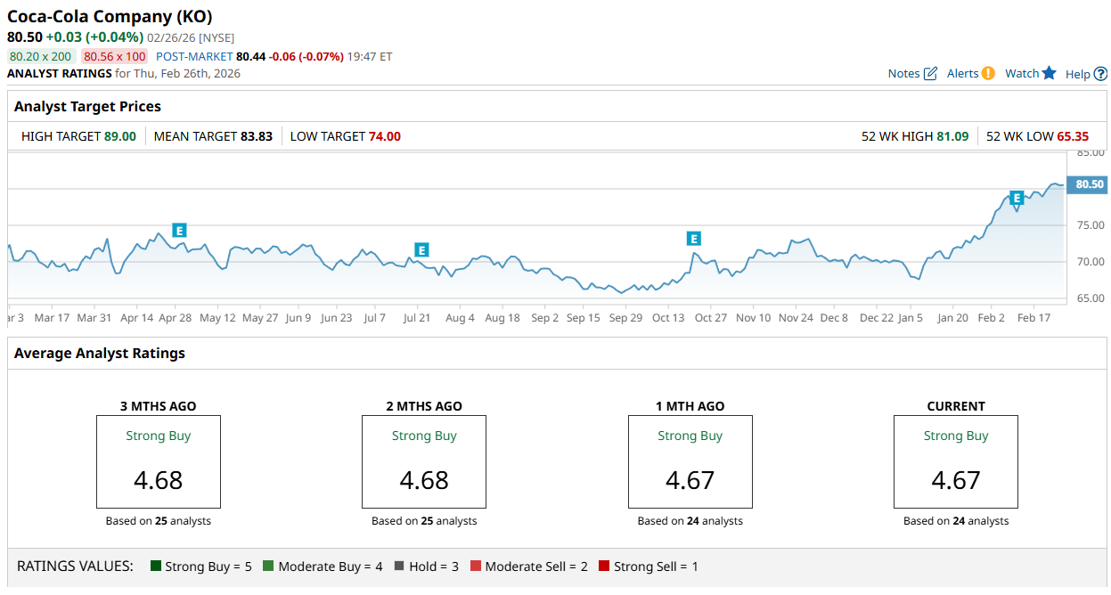 A consensus among 24 analysts rates Coca-Cola a “Strong Buy” with an average score of 4.67 and a high target price of $89, suggesting there's as much as 11% potential upside from here.