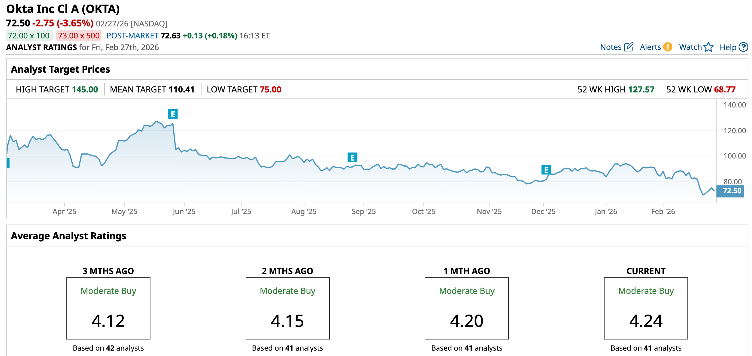 Okta is scheduled to release its Q4 fiscal year 2026 financial results after the market closes on Wednesday, March 4. Analysts expect Q4 EPS to rise 16% YOY to $0.29. For full-year 2026, they project 212.5% growth to $1.25, followed by another 20% increase to $1.50 in fiscal year 2027.