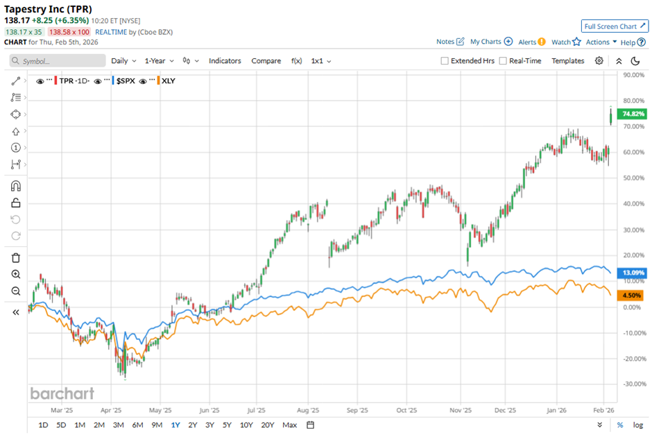 Shares of Tapestry surged 7.1% on Feb. 5 after the company reported Q2 2026 results that beat Wall Street expectations, with adjusted EPS of $2.69 and revenue of $2.5 billion. Investor sentiment was further boosted by strong operating performance, including a 620-basis-point expansion in GAAP operating margin, pro forma revenue growth of 18%, and standout 25% growth at the Coach brand. Additionally, Tapestry raised its full-year fiscal 2026 outlook, projecting EPS of $6.40 - $6.45.