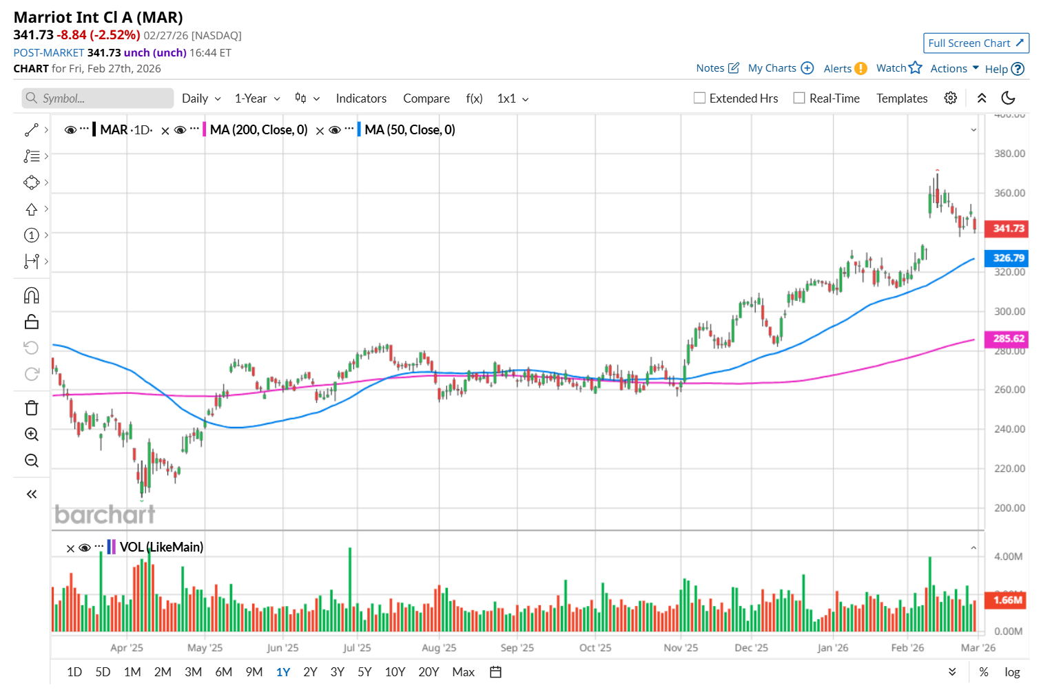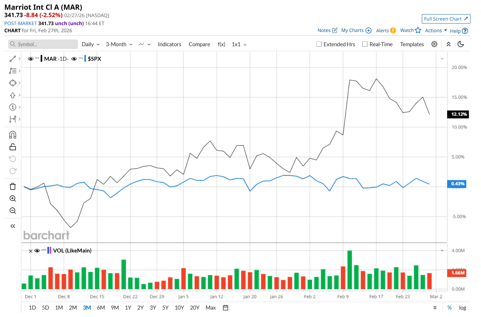 This lodging giant is currently trading 7.6% below its 52-week high of $370, reached on Feb. 12. Shares of MAR have surged 12.2% over the past three months, outperforming the S&P 500 Index’s ($SPX) almost 1% uptick during the same time frame.