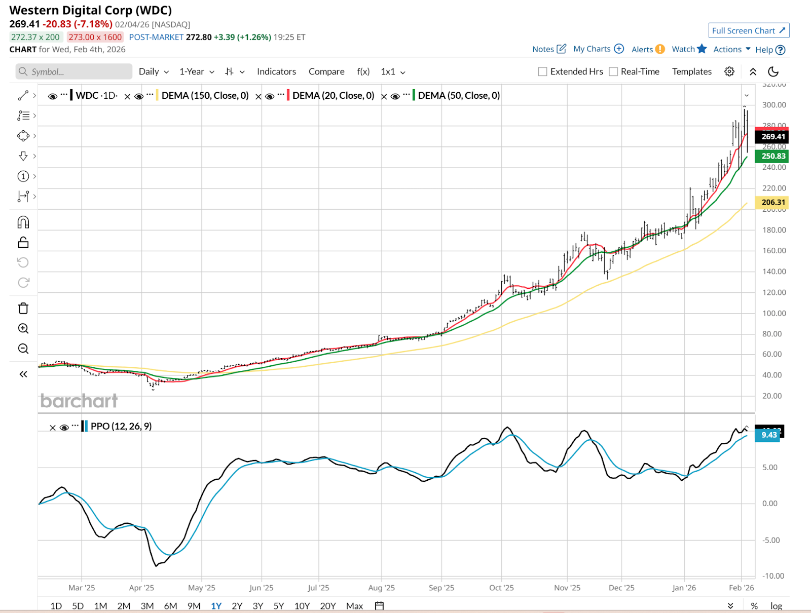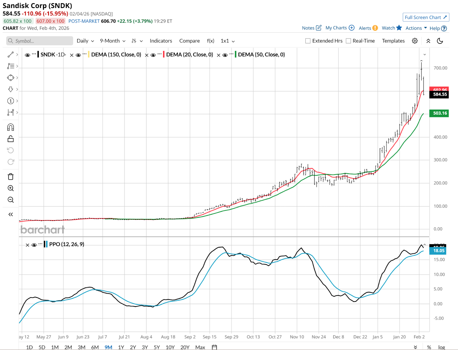 Sandisk (SNDK) sure was the hottest thing — for a minute. The stock flew higher to start the year but has given back a chunk of that recently. A 16% dive on Wednesday was the latest part of that. I could give you all of the narratives and fundamental aspects of it. But that’s easy to find using other Barchart tools. And in a case like this, since trees do not grow to the sky, suffice it to say that SNDK was due. Any stock that triples in a matter of weeks is automatically vulnerable in my book.