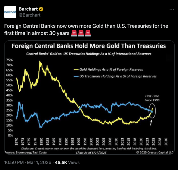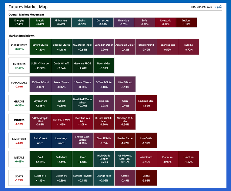Metals: Speaking of rallying commodities in the face of a firmer dollar, Monday morning’s Barchart Futures Market Heat Map shows the Metals sector followed only Energies higher overnight, though trailed at a considerable distance of 7.5% to 0.5%. Still, markets were impressive overnight as safe-have King Gold (GCJ26) gained as much as $186.20 (3.5%) and was still sitting $150 (2.9%) higher at this writing. I’ve said it for months/years: We can’t apply technical or fundamental analysis to the gold market given it is the most reliable safe-haven market on the planet these days. (If you argue it should be bitcoin, we can’t be friends.) As I pointed out recently, Barchart has run a piece showing foreign central banks now own more gold than US Treasuries for the first time in almost 30 years. There’s a good reason for that: A lack of confidence in the United States as a global leader. End of story. But gold wasn’t alone overnight as silver (SIK26) added as much as $4.00 (4.3%) before cutting its rally in half over the course of Monday morning. Dr. Copper (HGK26) the economic indicator was actually sitting in the red at this writing after initially jumping as much as 3.6 cents (0.6%).