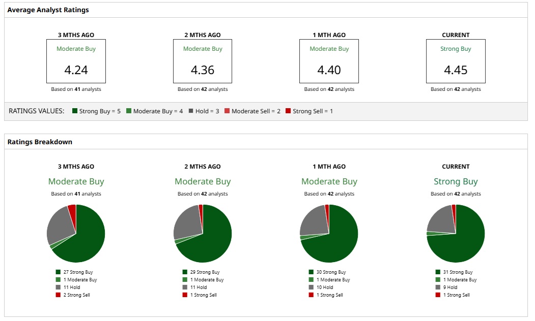 Based on 42 analysts with coverage, ORCL stock is a consensus “Strong Buy.” While 31 analysts assign a “Strong Buy” rating, one analyst has a “Moderate Buy" rating, nine analysts have a “Hold,” and one analyst offers a “Strong Sell" rating.