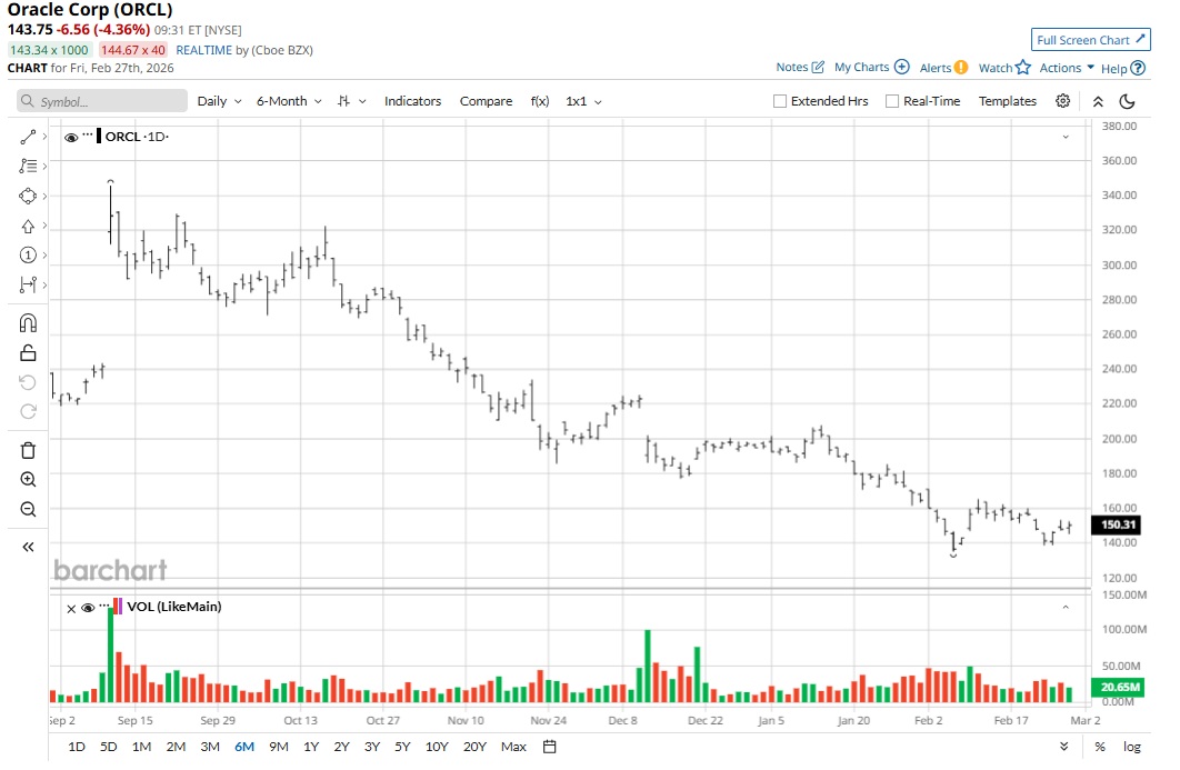 Headquartered in Austin, Texas, Oracle offers products and services for enterprise IT globally. The company’s main business segments include cloud, software, hardware, and services. For the first six months of fiscal 2026, the cloud and software segments contributed to 86% of total revenues.