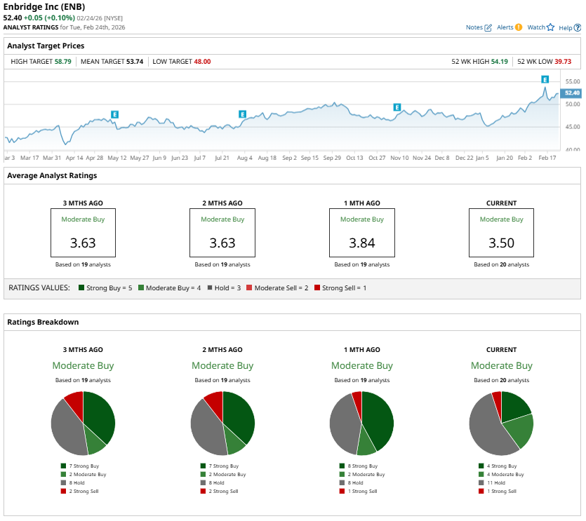 Wall Street analysts currently maintain a “Moderate Buy” consensus rating on ENB stock.