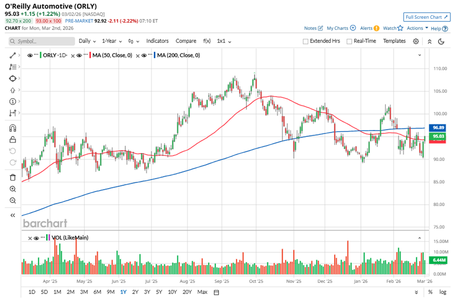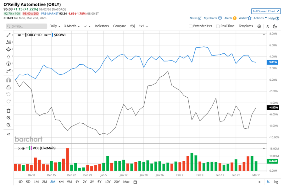 Despite its notable strength, ORLY slipped 12.6% from its 52-week high of $108.72, achieved on Sep. 30, 2025. Over the past three months, ORLY stock declined 4.8%, underperforming the Dow Jones Industrials Average’s ($DOWI) 3% gains during the same time frame.
