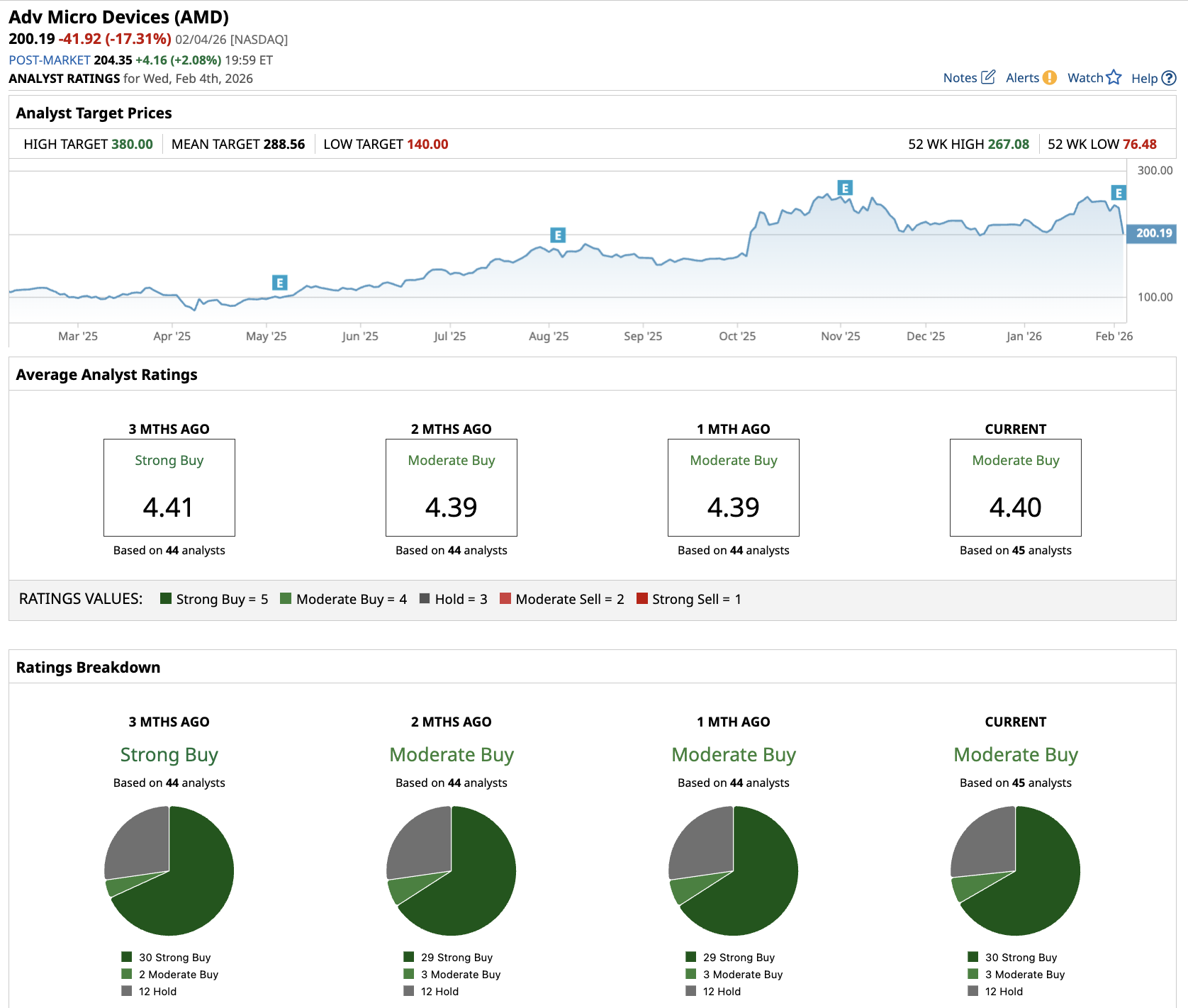 Out of the 45 analysts covering AMD stock, 30 recommend “Strong Buy,” three recommend “Moderate Buy,” and 12 recommend “Hold.” The average AMD stock price target is $289, above the current price of about $200.