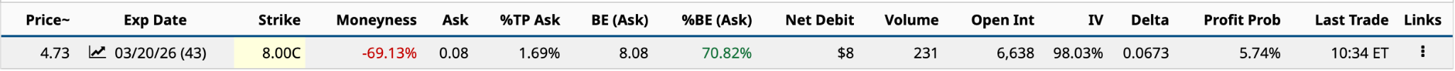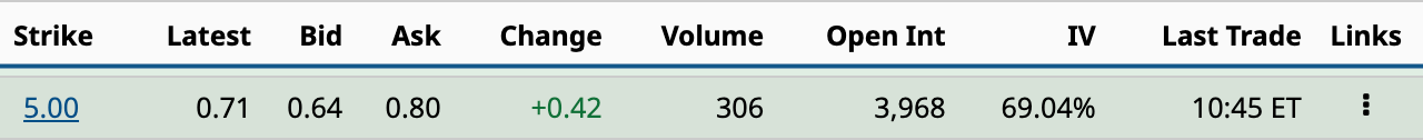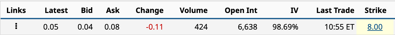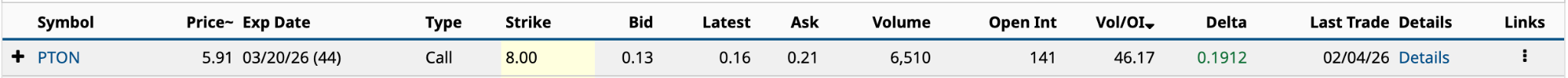 Peloton’s March 20 $8 call had the 14th-highest Vol/OI ratio yesterday at 46.17. The volume of 6,510 was about 10% of the total, its fourth highest in the past three months.
