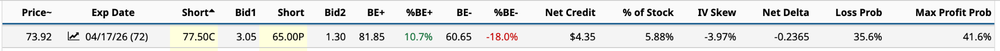The expected move, up or down, for the April 17 expiration is $7.99, or 10.35%, based on today’s share price of $77.43, which is up 2.5% as I write this.