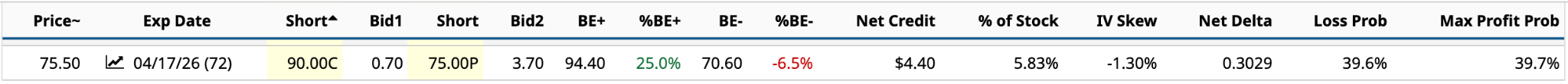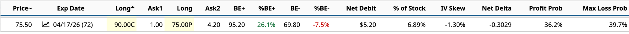 Based on the $90 call and the $75 put with a 13.46 Vol/OI ratio, these are the long (first one) and short (second one) strangles I’ve focused on.