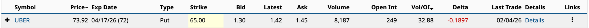 The top 25 Vol/OI ratios ranged from Strategy’s (MSTR) Feb. 13 $142 put at 140.22 to Uber Technologies’ (UBER) April 17 $65 put at 32.88.