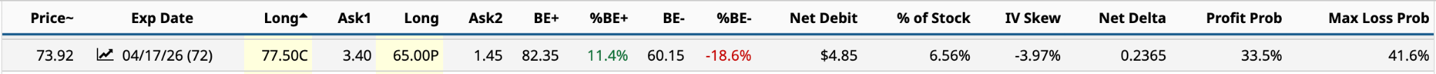 With an expected move of $8.37 (11.05%), I see the short strangle (second of the two) as the better bet for now. That’s because it will take another quarter or two for investors to realize Khosrowshahi is being conservative with Uber’s guidance. Then you’ll see bigger expected moves as we enter 2027. At that point, long strangles should be the play.