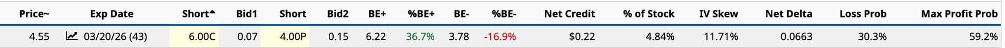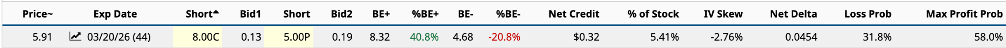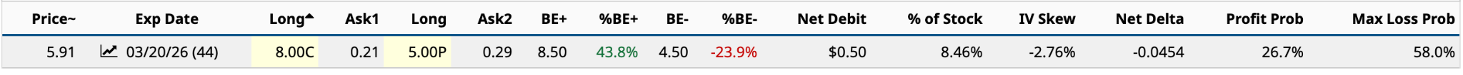 Based on the $8 call, these are the long (first) and short (second) strangles I’ve focused on.