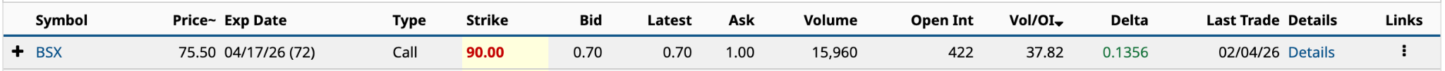 Boston Scientific’s April 17 $90 call had the 18th-highest Vol/OI ratio yesterday at 37.82. The volume of 15,960 was about 17% of the total, the second highest in the past three months. The action on the $90 call was spread relatively evenly between institutional and retail investors -- there was only one trade of 1,000 or more.