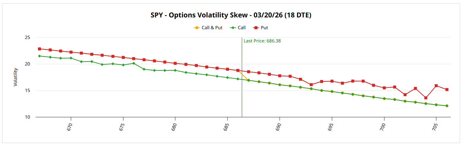 I believe this dynamic is especially meaningful for massive macro events like the Iran strike. Essentially, fund managers hedge their risk at the index level first before the risk positioning hits individual names like WMT stock. Sure enough, by analyzing the SPY ETF’s volatility skew (for the same March 20 expiration date), we find similar risk-management dynamics.