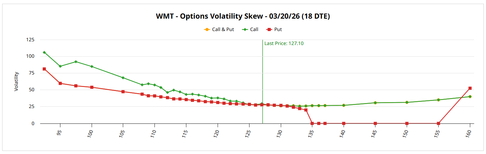 For WMT stock, the upcoming March 20 monthly options chain reveals that the skew is very controlled but has an upward bias at the left-hand boundaries (toward lower strikes). While no one is panicking, the smart money is more concerned about protecting against a big loss than it is positioning for a big gain.