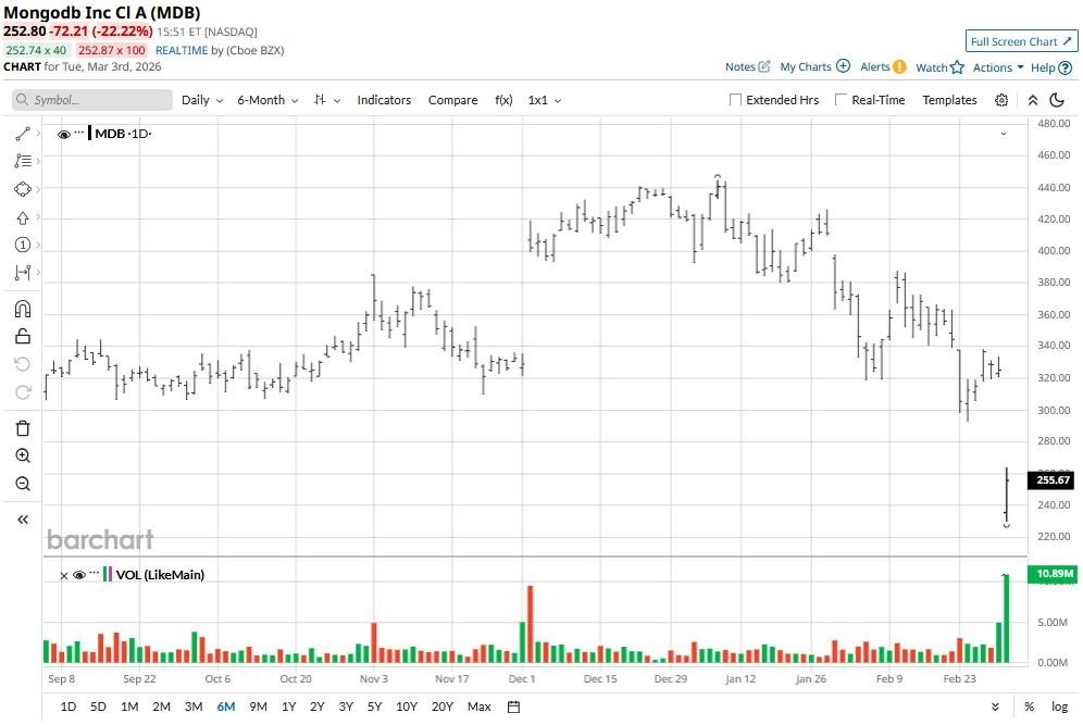 Wall Street analysts remain largely bullish on MongoDB for the remainder of 2026. According to Barchart, the consensus rating on MDB shares remains at “Strong Buy,” with the mean target of about $445 indicating potential upside of more than 75% from here.