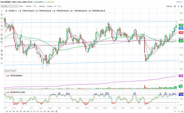 Recent news from the USDA’s Ag Outlook Conference, suggests a drop in planted acreage for Corn in 2026. This is a preliminary number, but they pegged a drop from 98.8 million acres in 2025 to 94.0 million in 2026. The next look at acreage from the USDA will be the 31st of March, with the Prospective Plantings report coming out at 11 AM that day. We’ll also get the Quarterly Grain Stocks data at that time. Next week on the 10th, the USDA will release the monthly Crop Production and Supply/Demand numbers.