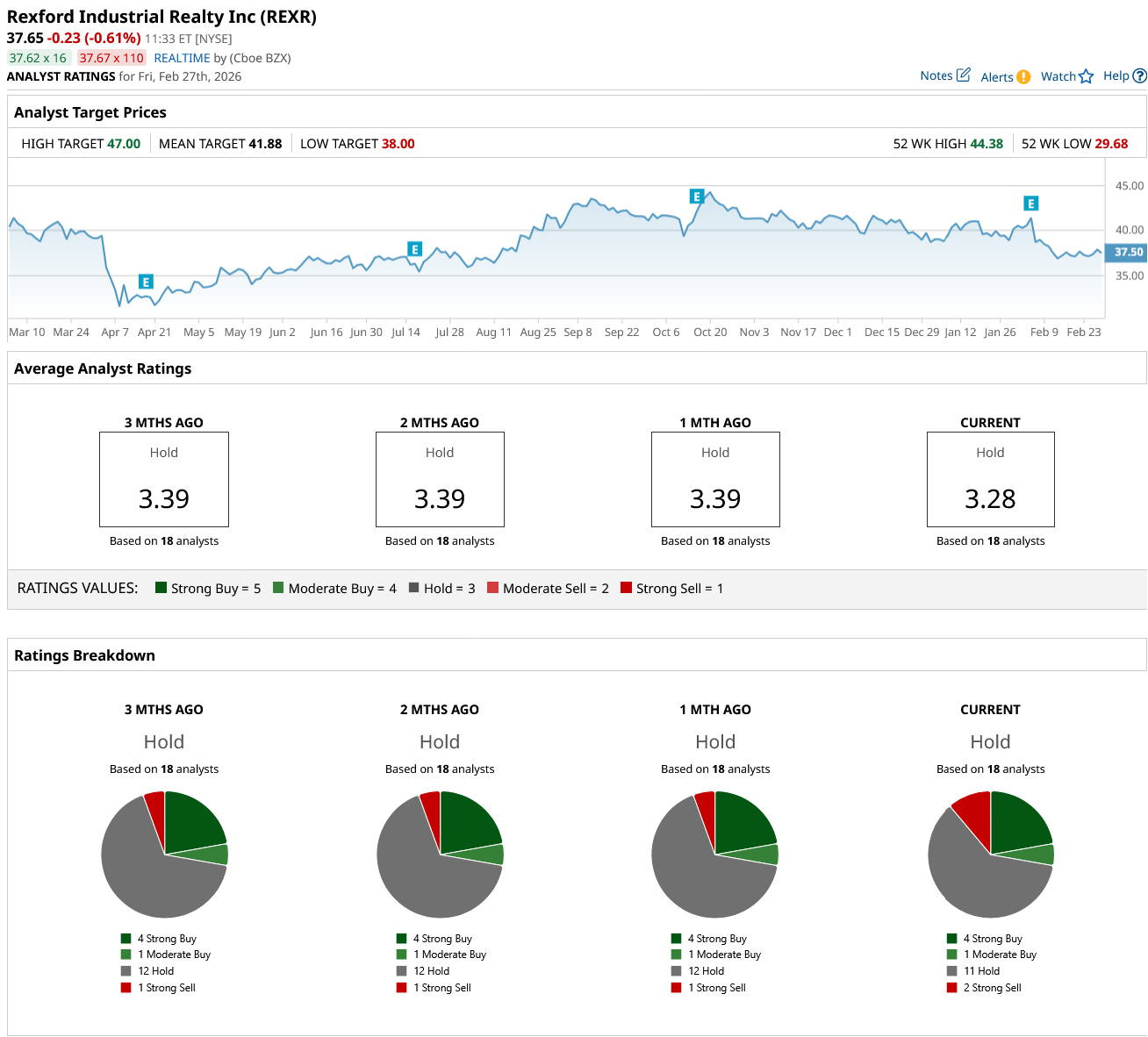 On Wall Street, overall REXR stock is rated as a “Moderate Buy.” Out of the 18 analysts who cover REXR stock, four rate it a "Strong Buy," one recommends a “Moderate Buy,” 11 rate it a “Hold,” and two suggest a “Strong Sell.” Its average price target of $41.88 suggests that the stock can increase by 11% over current levels. However, its high target price of $52 implies an upside potential of 38% over the next 12 months.