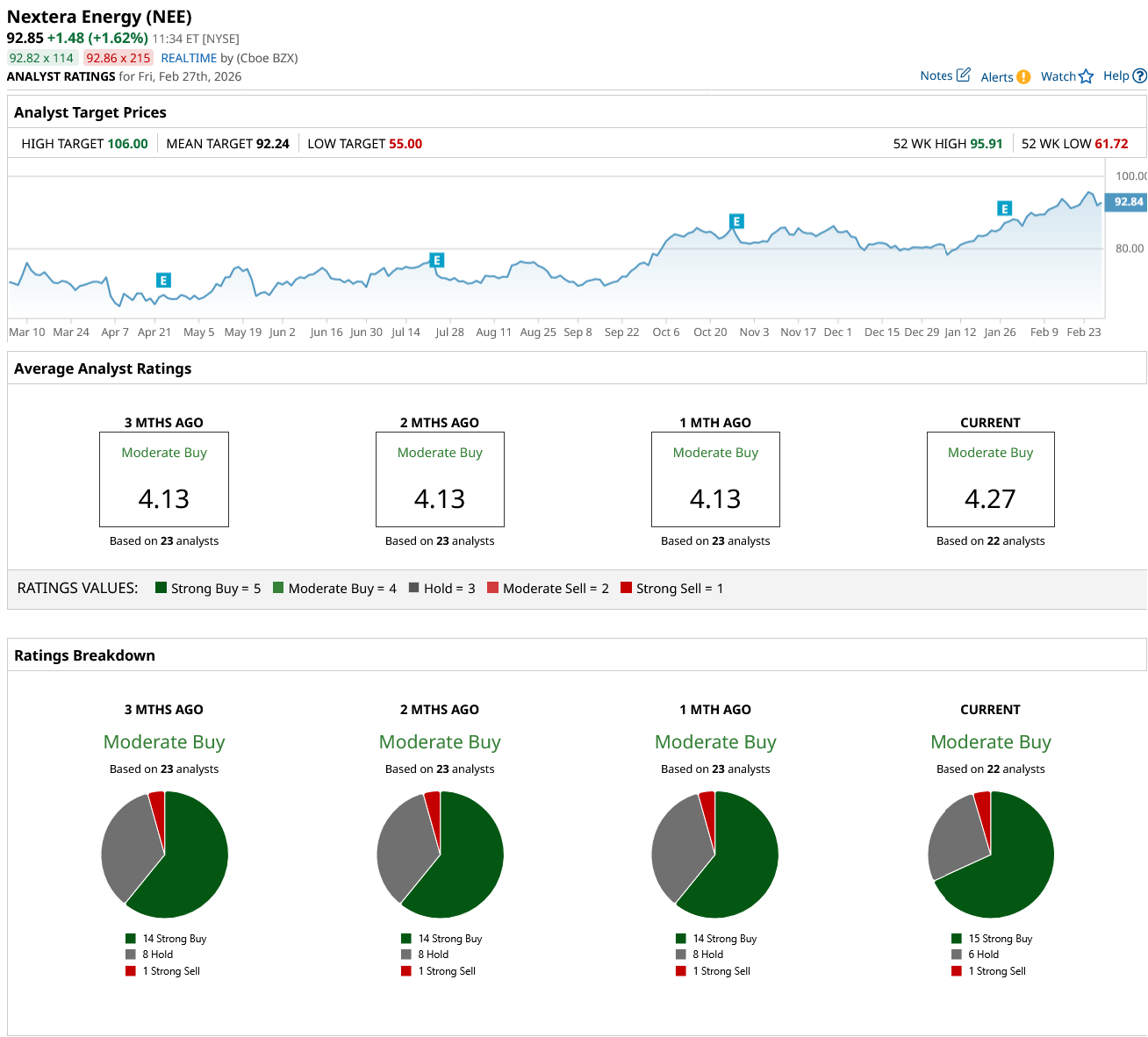 Overall, Wall Street rates NEE stock as a “Moderate Buy.” Of the 22 analysts that cover the stock, 15 rate it a “Strong Buy,” six suggest a “Hold,” and one suggests a “Strong Sell.” The stock is trading close to its average target price of $92.24. But its Street-high estimate of $106 further implies NEE stock can go as high as 14% in the next 12 months.